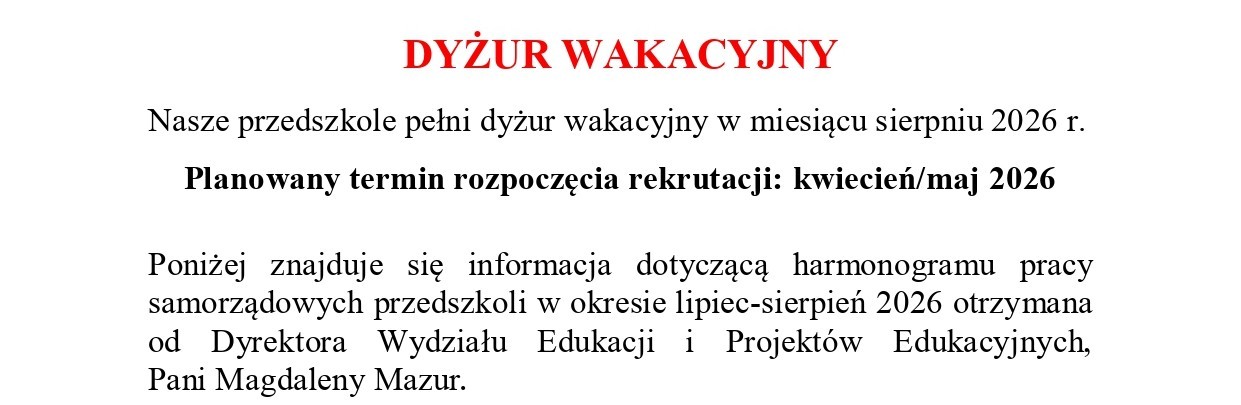 Dyżur wakacyjny 2026 r. https://portaledukacyjny.krakow.pl/aktualnosci/308988,1812,komunikat,harmonogram_przerw_wakacyjnych_w_przedszkolach_na_2026_rok.html Czytaj więcej