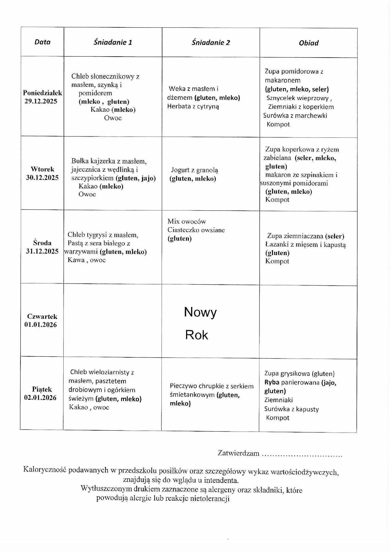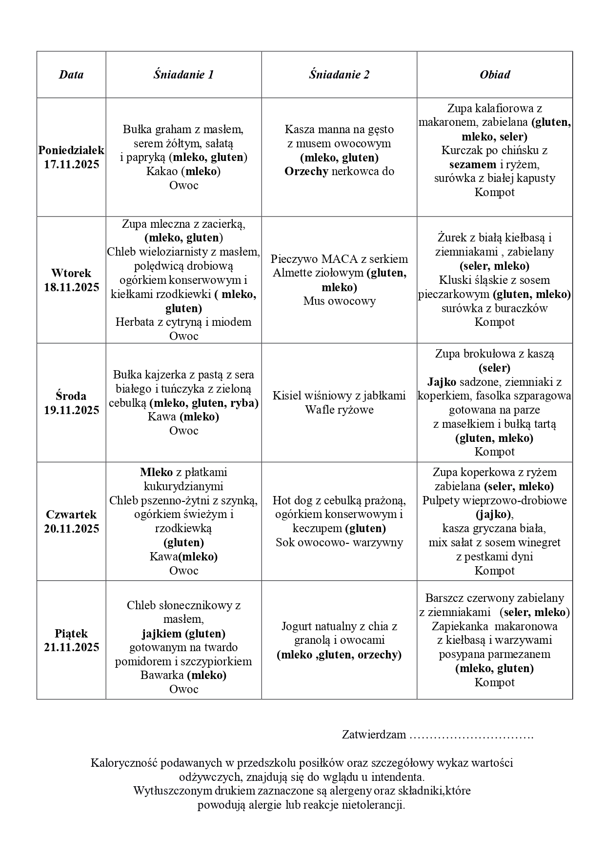 Jadłospis również dostępny jest na tablicy ogłoszeń w Przedszkolu.