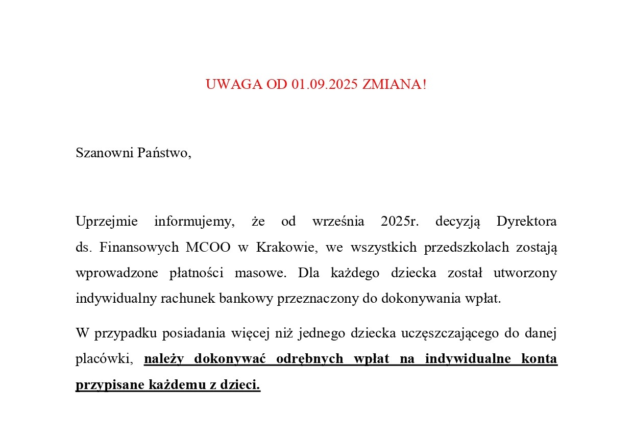 Wpłaty za pobyt dziecka w przedszkolu prosimy dokonywać na konto o numerze